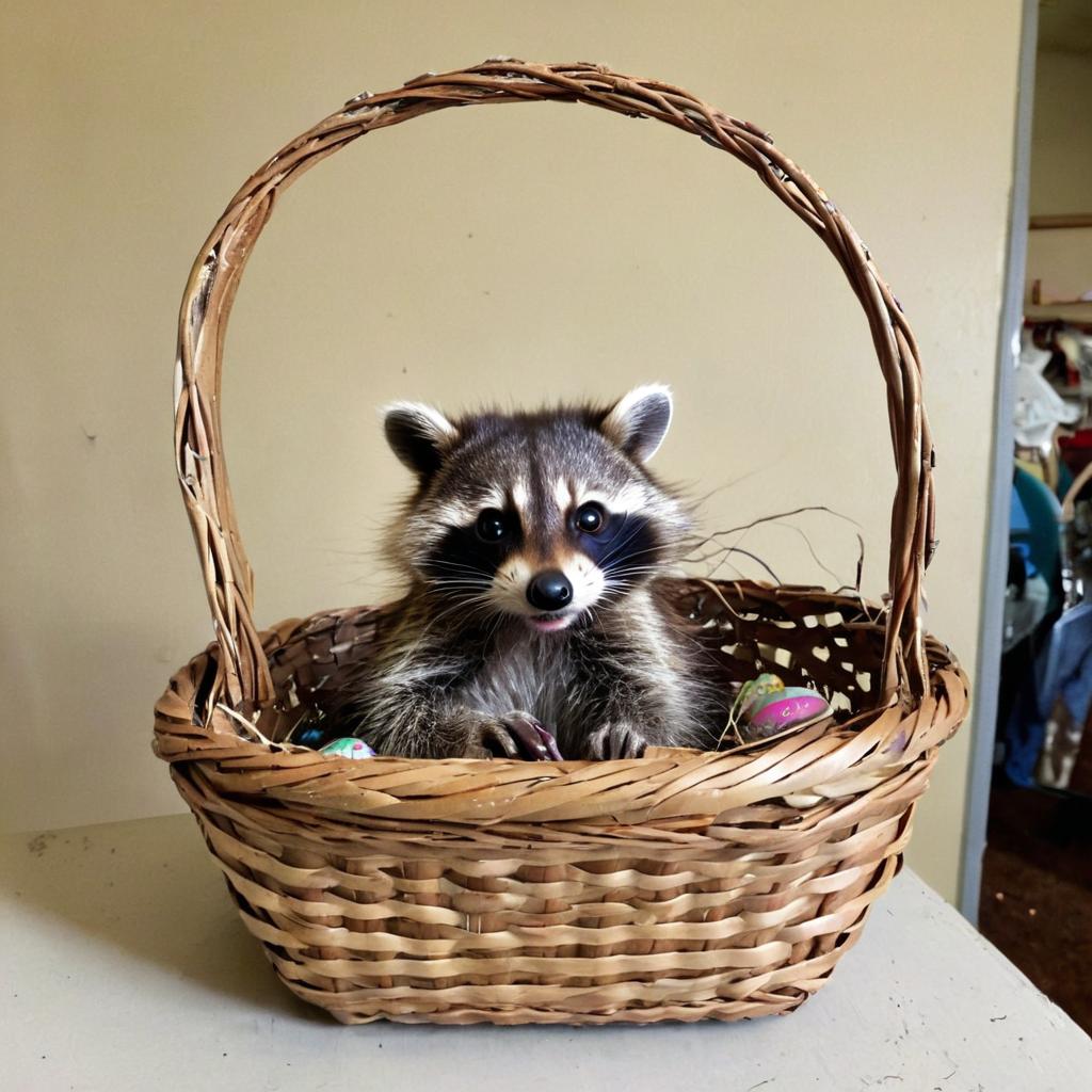 Found this old Easter basket at a thrift store today… looks like it’s seen better days, but seems sturdy enough for my resident raccoon to give it a whirl. Maybe he’ll find some hidden treasure inside.