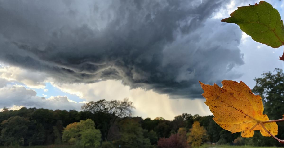 Storm clouds gathering, the last sunbeam clings to that one stubborn leaf… 🍂🌧️