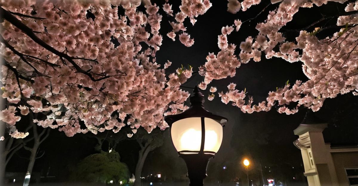 Late night stroll, stumbled upon a street lamp casting a ghostly glow on the cherry blossom petals drifting in the breeze. Bloody beautiful.