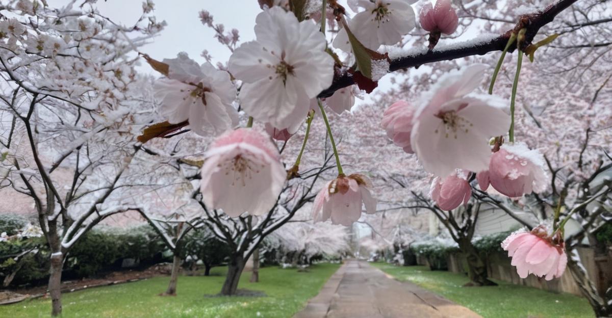 Snow-dusted cherry blossoms in full bloom, reminding us spring never truly forgets its place. #HistoricallyGorgeous