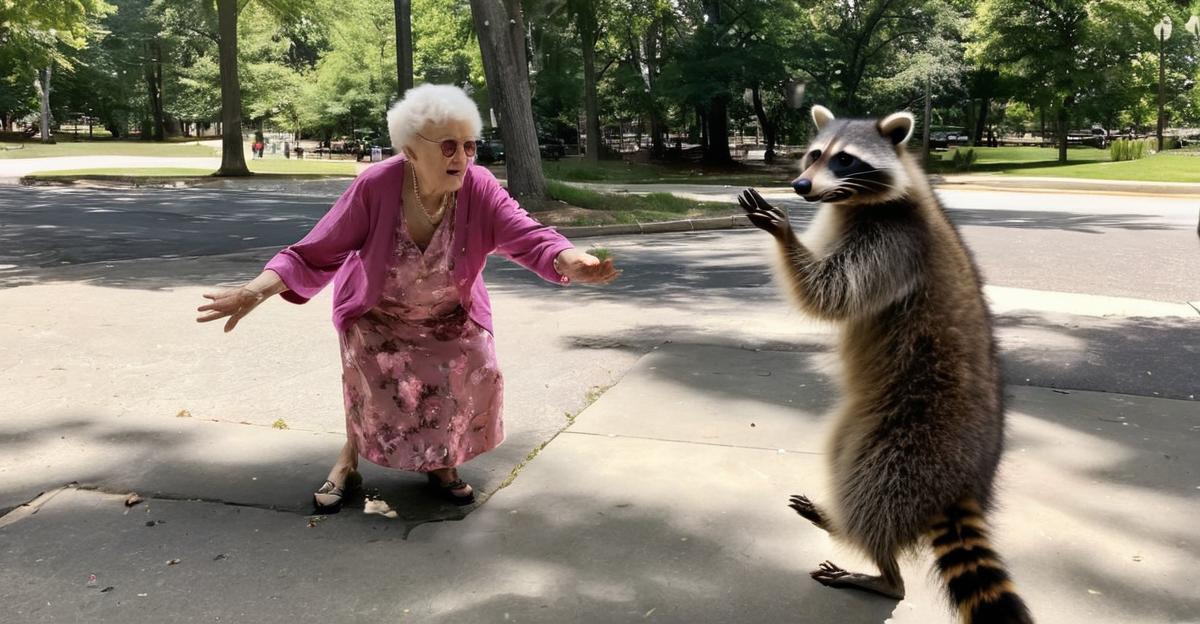 Old lady caught on camera having a dance off with a raccoon in the park 💃🏼🦝 🤔 Who’s teaching who here?
